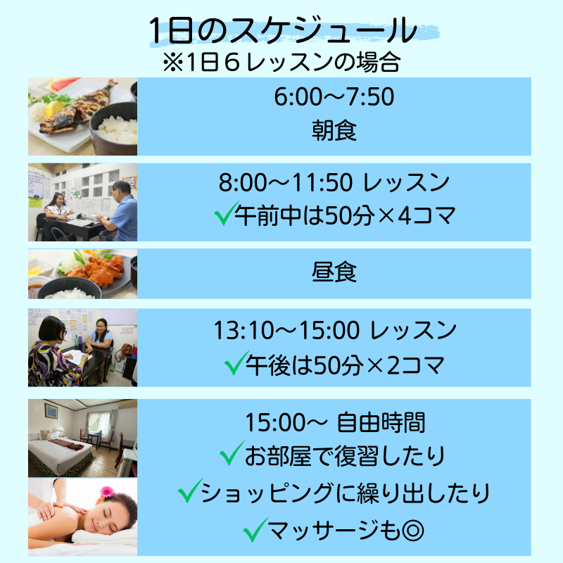 | 教材費 | 1,000ペソ | 4週間滞在の場合の目安です。 進捗状況や滞在期間により異なります。 ※ビジネスコースの場合は1,500ペソほどかかります。 |